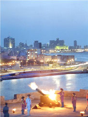 Cada día, siempre a las nueve de la noche una buena parte de La Habana siente el retumbar de un familiar estruendo. Se traba del tradicional cañonazo que marca con exactitud la llegada a las 21 horas. De ello se encarga un añejado cañón conducido por hábiles manos que dispara una salva desde la Fortaleza de San Carlos de la Cabaña, lugar desde donde se domina un paisaje parcial de la Ciudad de La Habana. El cañonazo de las nueve, como se conoce popularmente en Cuba, es una tradición que se inició en el siglo XVIII cuando desde la propia Fortaleza disparaban una salva a las seis de la mañana para anunciar la apertura de las puertas de la ciudad, que se cerraban a las nueve de la noche. Durante la lejana epoca la pequeña capital de Cuba estaba rodeada por una muralla que definía sus límites; de aquella obra quedan algunos tramos en lo que hoy es La Habana Vieja, Patrimonio de la Humanidad.